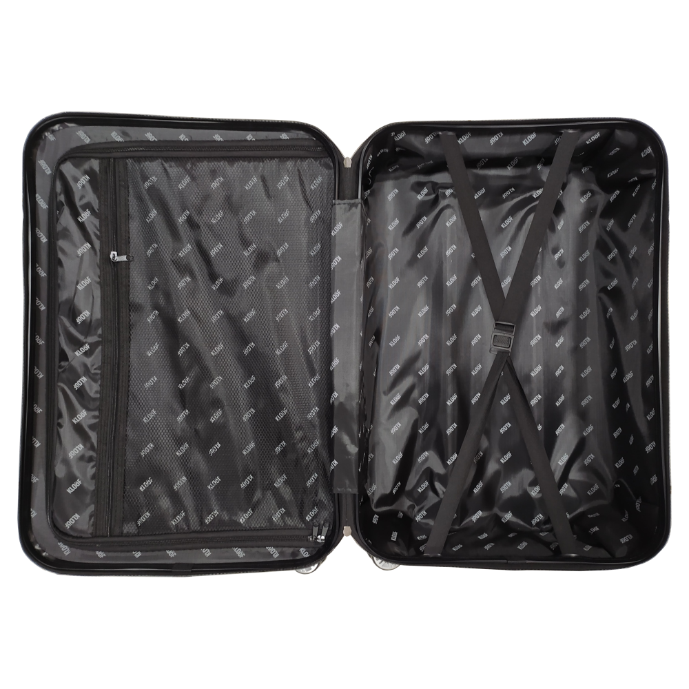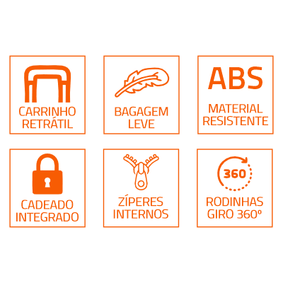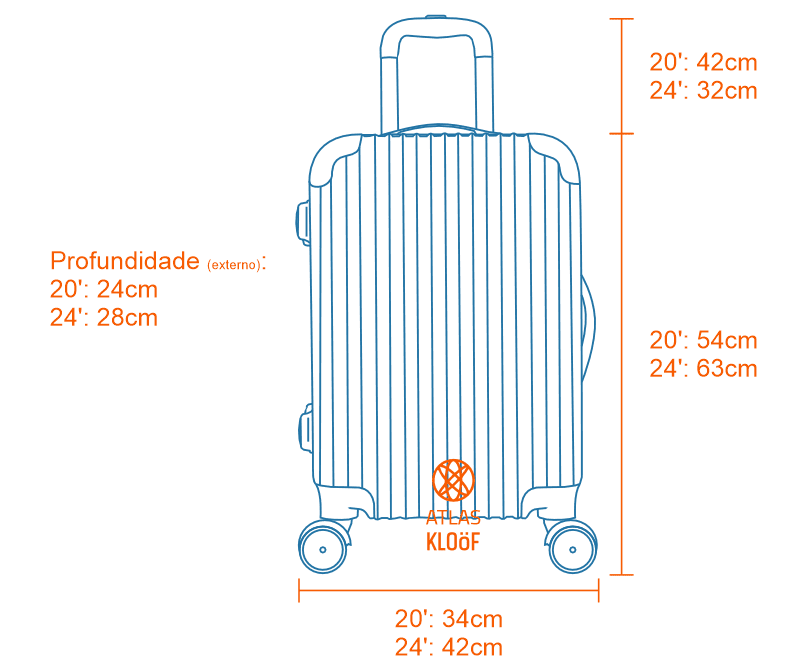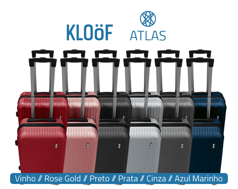 Marca: Kloöf Material resistente 100% ABS. Interno: Compartimento principal com divisória de zíper. Externo: Não possui bolso. Fechamento principal com zíper. Cadeado de segredo TSA. Estrutura rígida e arredondada. Elástico para fixar as roupas. Impermeabilidade, fácil de limpar e resistência. Quatro rodas duplas com giro de 360 graus. Alça de mão Retrátil e Superior. |